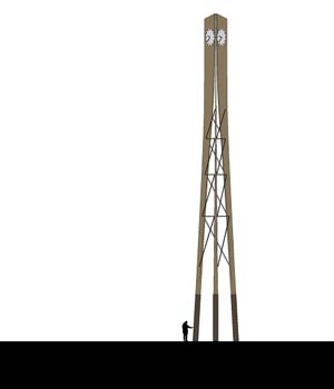 This concept reflects a historic railroad trestle, common throughout the country. At the same time, modern design elements have been added to the tower to give it a timeless feel. This clocktower concept has three support footings at ground level and three clock faces.