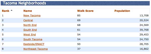 So we tried another address – one we used the last time we wrote about Walk Score. Back in 2007, our house had a score of 73; it’s now up to an 88. We find it to be a pretty walkable neighborhood, with most of what we need close by, and bus lines not too far off, but we’re not sure what the improvement over the last five years has been. City Hall gets a score of 95, making it a “Walker’s Paradise.” Perhaps even more interesting than block-by-block scores, however, are the scores given to Tacoma’s neighborhoods. Hmm…