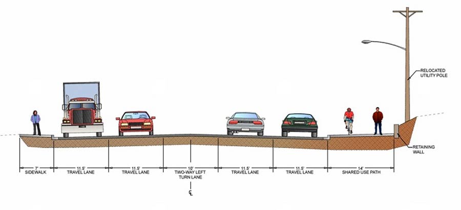 Alternative 1 (shown above) adds a raised concrete path wide enough for both pedestrians and cyclists to the north south side of the street, giving cyclists a grade separation from vehicles. This added space is created with a retaining wall on that side of the street. Parking would be reduced, but the roadway would remain the same for traffic.