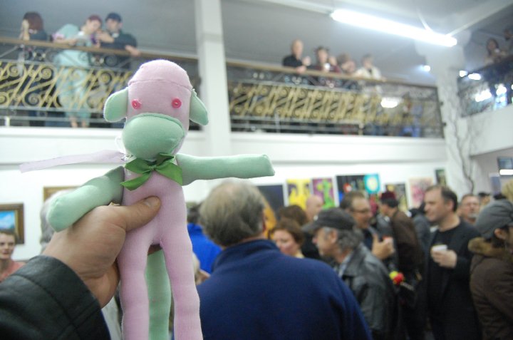 The latest 100th Monkey celebration came and went last night at the Speakeasy Art Cooperative. It defined monkey business, with handmade sock monkeys proving to be hits.