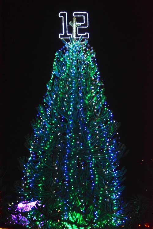 A huge tree strung with lights in Seahawks’ blue and green towers over the Point Defiance Zoo & Aquarium plaza at the entrance to Zoolights. And the tree is topped with a large lighted 12 in honor of the 12th Man, the term representing the team’s loyal and exuberant fans.