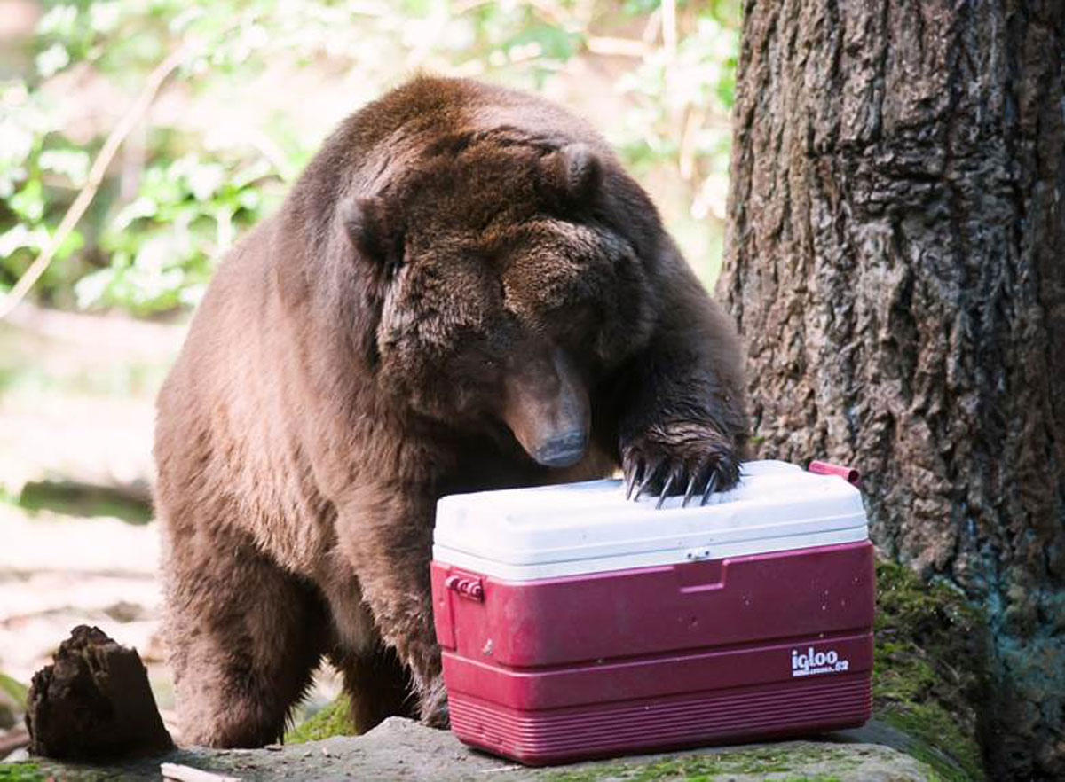 An unsecured camping cooler with food is no match for a curious – and hungry – grizzly bear. Bear Camp at Northwest Trek Wildlife Park will provide visitors with information on how to camp safely in bear country.
