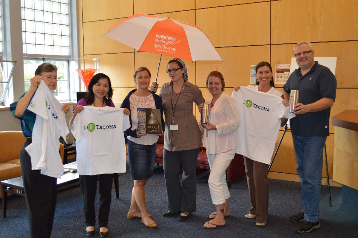 Tacoma Public Schools won the Walk Tacoma Business Award by having employees at 7 out of the 8 Walk Tacoma events this year. Participants from TPS (not all shown in the photo) won passes to the Museum of Glass and Tacoma Art Museum, as well as Walk Tacoma t-shirts, DOTG umbrellas and mugs, and coffee table books from the MOG. Congratulations TPS walkers! |
