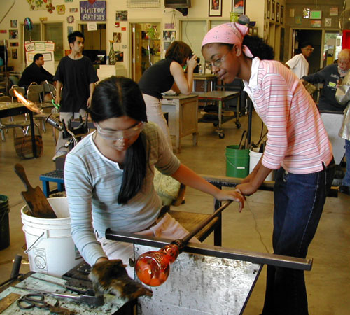 Hilltop Artists started as a small summer program in a former woodshop at Jason Lee Middle School in 1994. With only limited equipment available, the students explored a variety of media and their first experience with glass involved heating up Snapple™ bottles and manipulating them into new shapes.