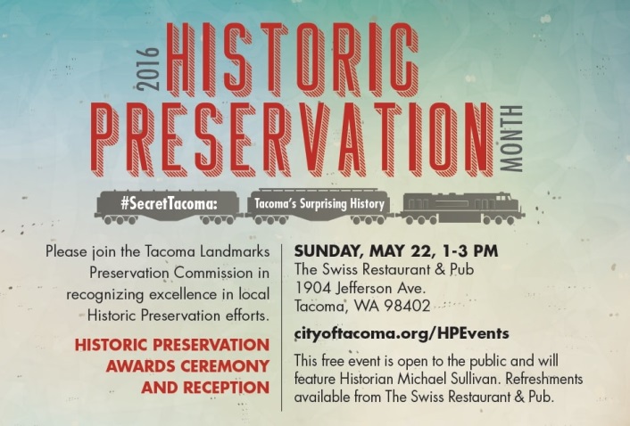 The Historic Preservation Awards ceremony and reception is on Sunday, May 22, from 1 – 3 p.m. at the The Swiss Restaurant & Pub (1904 Jefferson Ave. in Tacoma). The event is free and open to the public and refreshments will be available. Historian Michael Sullivan will speak at the reception about Prohibition-era Tacoma.