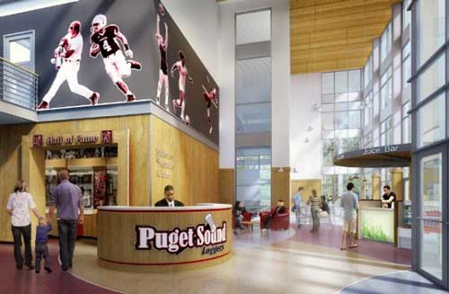 To create the center, Puget Sound will upgrade and expand the athletic facilities within Memorial Fieldhouse and Pamplin Sports Center, and add a new aquatics center. Additions will include a fitness center, rowing ergometer room, climbing wall, enhanced training room, juice bar, team meeting room/classroom, and coaches’ offices. A new Hall of Fame area will pay tribute to Logger alumni from all eras. Additionally a new northwest entrance and reception area—with three-story, floor-to-ceiling windows—will complement the reconfigured north entrance of Memorial Fieldhouse.