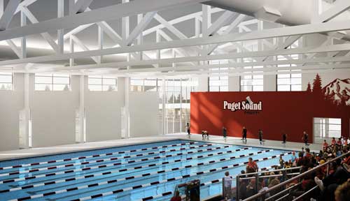 The Athletics and Aquatics Center will be home to Puget Sound’s 2600 students, 600 faculty and staff, 23 varsity teams, and to hundreds of intramural athletes. In addition to providing a state-of-the-art home for Puget Sound’s competitive championship swim teams, it will provide physical fitness facilities for campus members and the community, and serve academic programs such as exercise science, physical therapy, and occupational therapy.