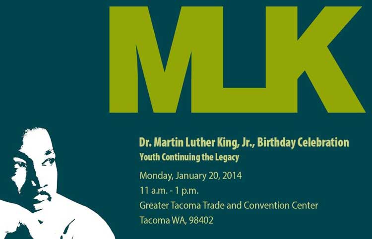 Those selected after the audition period is over, would be asked to attend the mandatory event rehearsals on Saturday, Dec. 7, 2013, and Saturday, Jan. 11, 2014, and ultimately perform before a crowd of 2,000 – 3,000 people at the 26th Annual Martin Luther King, Jr. Birthday Celebration on Monday, Jan. 20, 2014 from 11 a.m. until 1 p.m. at the Greater Tacoma Convention and Trade Center (1500 Broadway in Tacoma). The theme this year is Youth Continuing the Legacy.