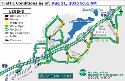 In an effort to give military personnel, base employees and area residents a way to gauge traffic flow around JBLM entrance and exit gates along I-5, the Washington State Department of Transportation worked cooperatively with JBLM officials to install a traffic detection system that uses anonymous Bluetooth technology to show real time traffic conditions. The Bluetooth data are displayed on the map alongside the I-5 radar detection system.