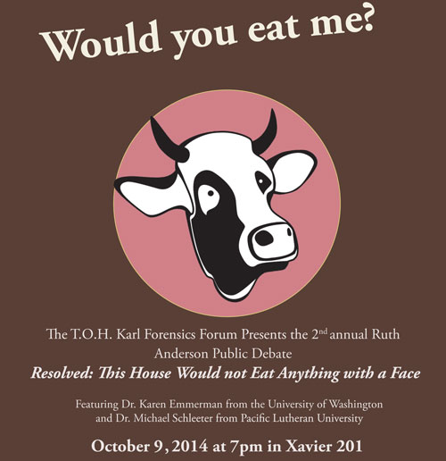 TACOMA, Wash – What goes into the production of a quarter pound burger? According to J.L. Capper in The Journal of Animal Science, 6.7 pounds of feed, 52.8 gallons of drinking water, 74.5 square feet of grazing, and the equivalent amount of energy it takes to run a microwave for 18 minutes. The average American eats approximately 271 pounds of meat a year—or three, quarter pounder burgers a day. Meat is a tasty part of culture; it's a part of our special holidays and our daily meals, but is the product worth the cost? On Thursday, October 9, 2014, at 7 p.m. this year's Ruth Anderson Public Debate asks, is it right to eat animals? You’re invited to Pacific Lutheran University (PLU) to dig in to this issue.