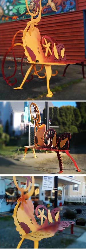 The benches, hand-crafted by local artist Jennifer Weddermann, are made of steel, and have aquatic and octopus imagery, along with gears and mechanical elements that represent the district’s strong, manufacturing history. Two of the sculptural benches have additional elements - one has a bike rack while the other hinges to allow users to sit facing two directions.