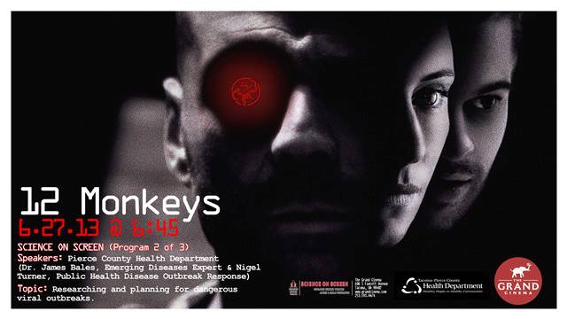 The Grand Cinema and The Tacoma Pierce County Health Department are proud to share that they will be collaborating for an evening of “Science on Screen” on June 27th. Emerging Diseases expert Dr. James Bales and disease outbreak control public health leader Nigel Turner will give a presentation about researching and planning for dangerous viral outbreaks which will be followed by a screening of the 1995 cult classic film “12 Monkeys.”