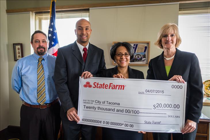 State Farm Insurance Agents Tony Brooks and Wendi Thomas presented the City of Tacoma with a $20,000 check on behalf of State Farm on April 7.