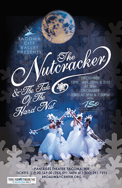 Tickets for Tacoma City Ballet’s The Nutcracker and The Tale of The Hard Nut,are on sale now at the Broadway Center for Performing Arts Box Office! Tickets range between $19-$69 for: Performances on Saturday, December 13 & 20 at 3:00 PM, Sunday, December 14 & 21at 3:00 PM, and Tuesday, December 23rd at 3:00 PM & 7:30PM. To Order Tickets: Online, please visit www.broadwaycenter.org, or Call (253) 591-5894, or In Person at the Broadway Center Box Office, 901 Broadway, Tacoma.