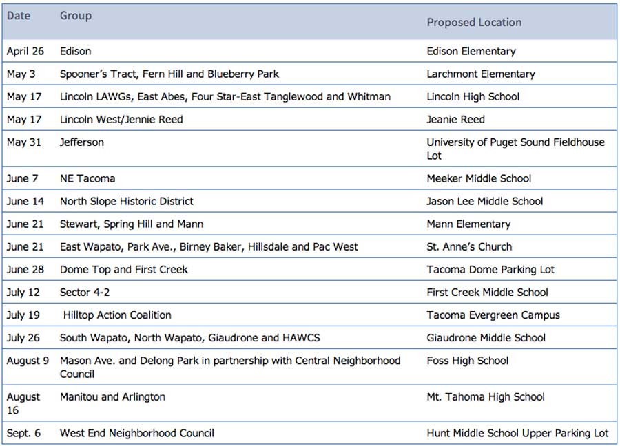 Neighborhood groups also can find the community cleanup schedule at cityoftacoma.org/communitycleanup.