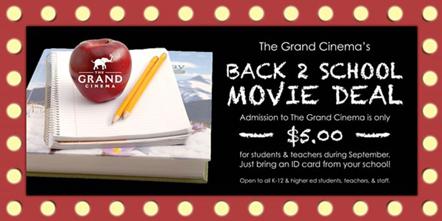 To receive the discount, eligible patrons must bring a current school ID card to The Grand Cinema box office at the time of their ticket purchase. Regular priced tickets to films at The Grand are $9.50 for evenings and $7.50 for matinees with $2 off for students, seniors, and armed services members and $2.50 off for Grand Cinema members.
