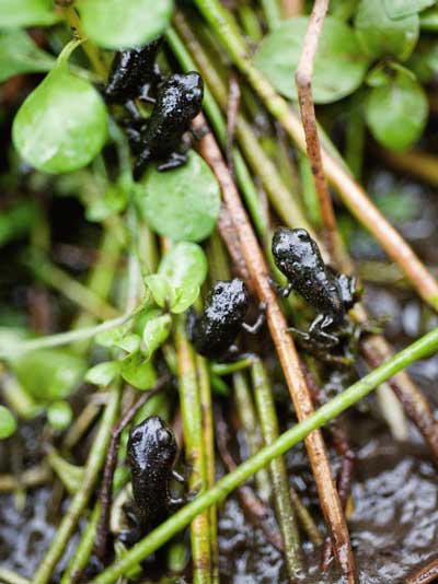 The tadpoles eventually metamorphose into tiny toads, or toadlets, and begin their migration onto land.