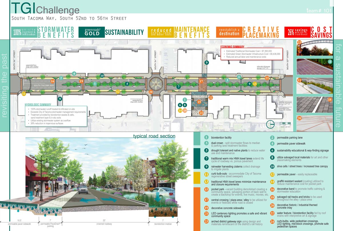 Capturing the award for green roadway design, for the City of Tacoma sponsored South Tacoma Way business district site, was the “Keep it Green” team from KPG. KPG is a local engineering firm in Tacoma known for sustainable Greenroad® designs.