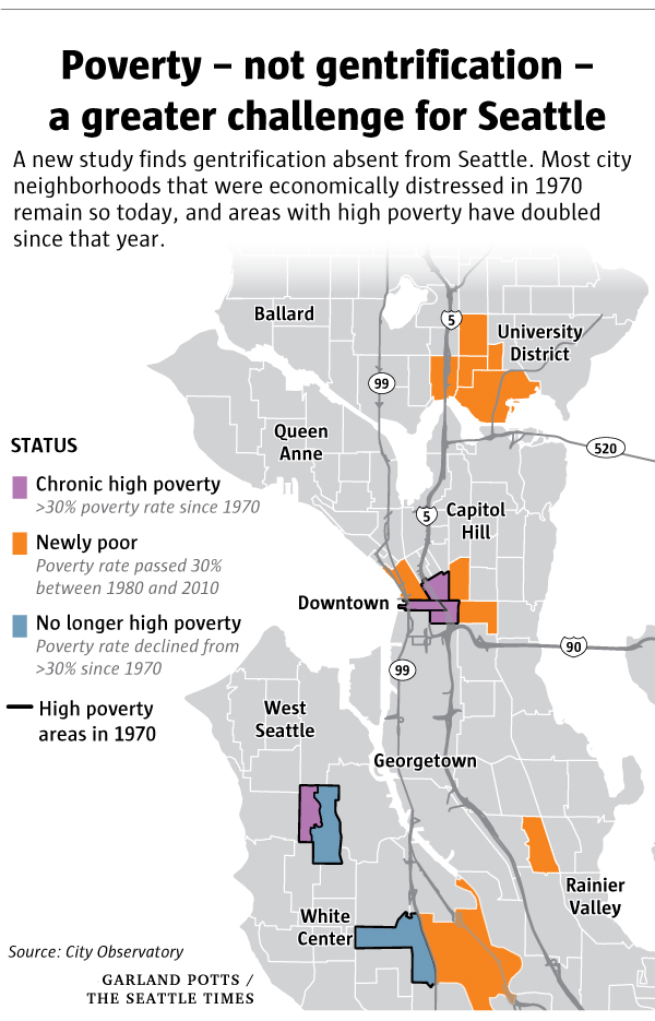 The report finds that no Seattle neighborhood meets that gentrification test - in fact very few neighborhoods from the 50 cities surveyed do. Basically the trend is that nicer neighborhoods have always been pretty nice, and poorer neighborhoods have always been pretty poor.